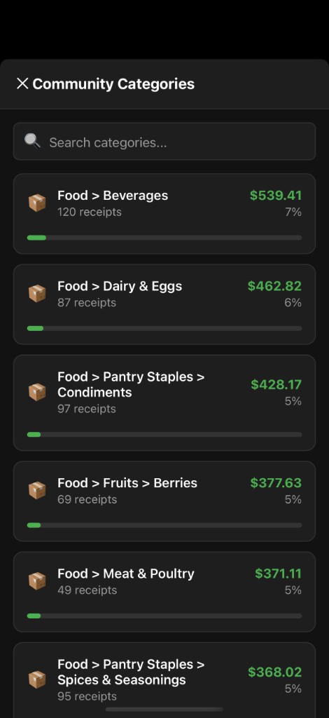 Community Categories shows aggregated spending by food category across all community submissions: Beverages, Dairy & Eggs, Pantry Staples, Fruits, Meat & Poultry, and more. Each category displays receipt count, total amount, and percentage of overall spending.