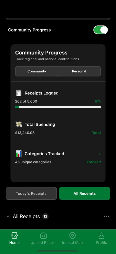 The Community Progress card lets users switch between Community (regional and national contributions) and Personal views. Receipts Logged, Total Spending, and Categories Tracked are shown for the selected scope. Tap Categories to drill into spending by category.