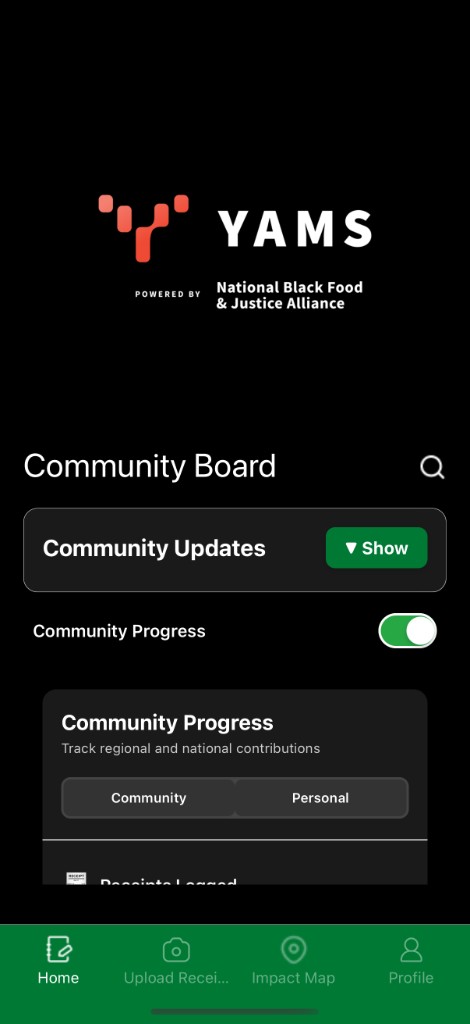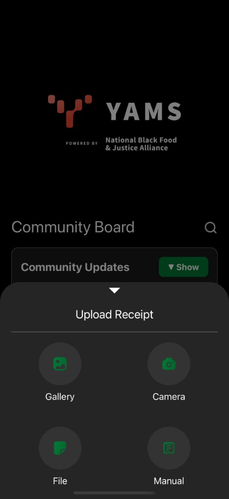 - 1Community members — photograph receipts via the Y.A.M.S mobile app and gain access to their own organized spending history and receipt archive