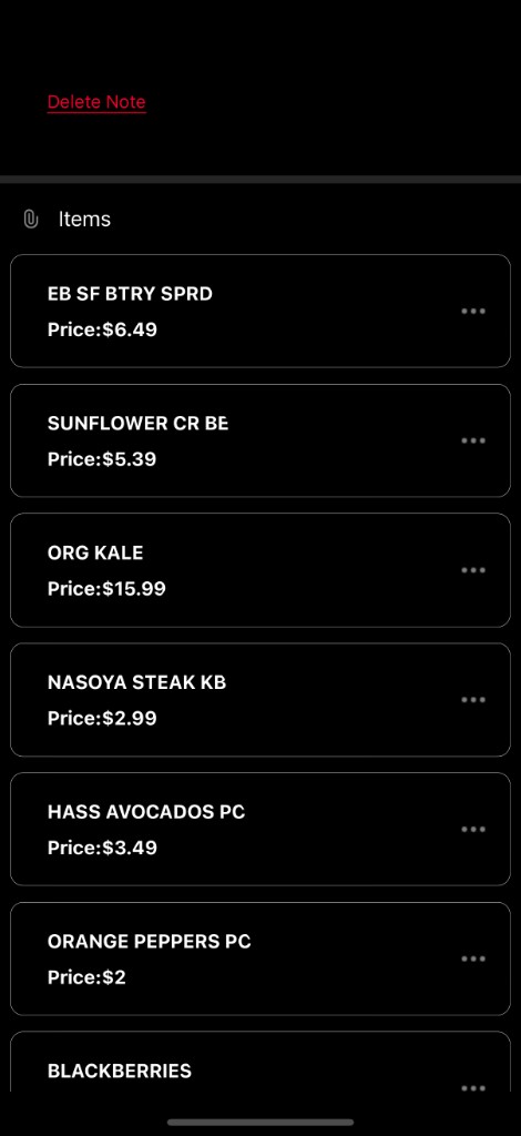Each receipt's line items are extracted and stored as a structured list. Users can view individual groceries with names and prices — the raw data that feeds category breakdowns and community analytics.