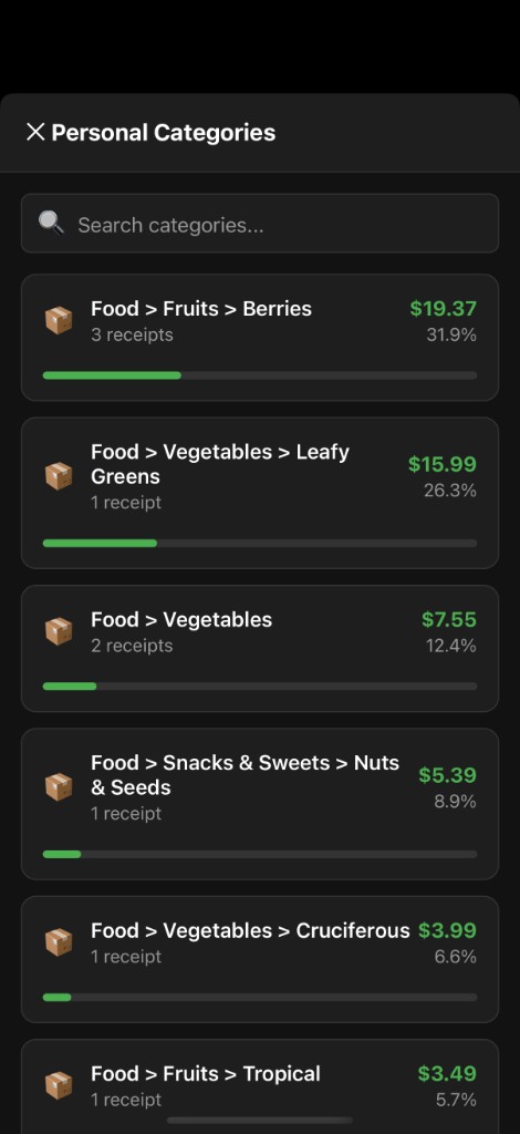 Personal Categories shows the user's own spending by category — Fruits & Berries, Vegetables, Snacks, and more. Receipt count, amount spent, and percentage of personal total help users understand their own purchasing patterns.